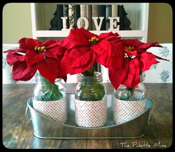 Christmas Centerpiece: Strips of craft paper and 3 Poinsettia blooms make this arrangement into a festive pop of color. Simply wrap a strip of paper around the outside of a jar and secure it with ribbon or double-sided tape. Add poinsettias or other holiday blooms and it's an instant centerpiece!
