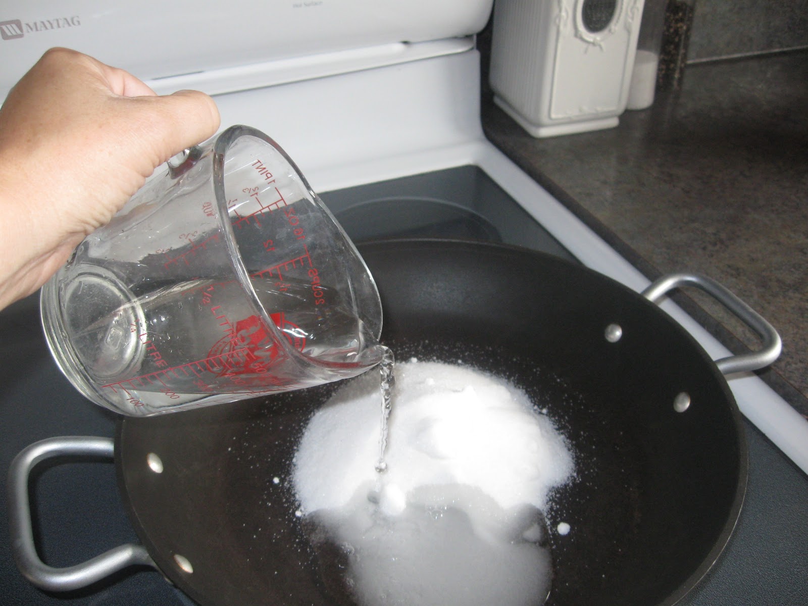 Pour the sugar and water in a heavy pan and bring to a boil over medium high heat, stirring often.