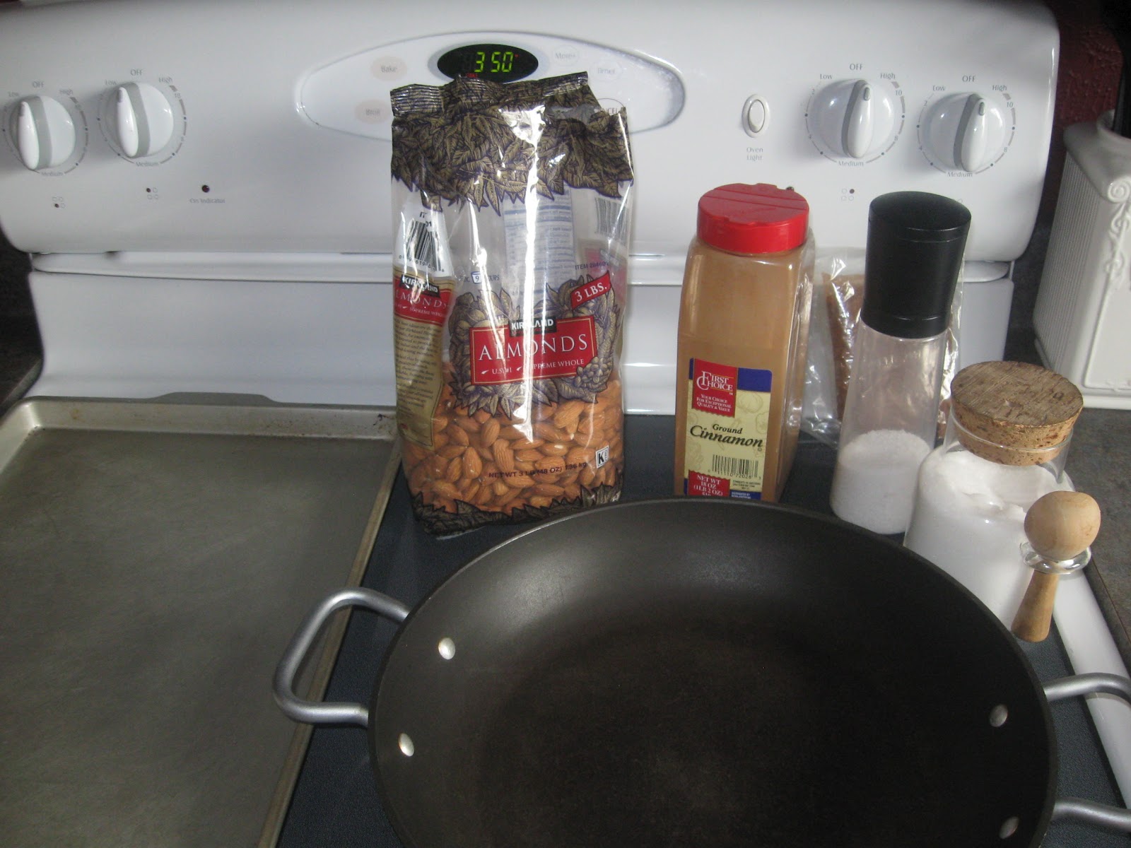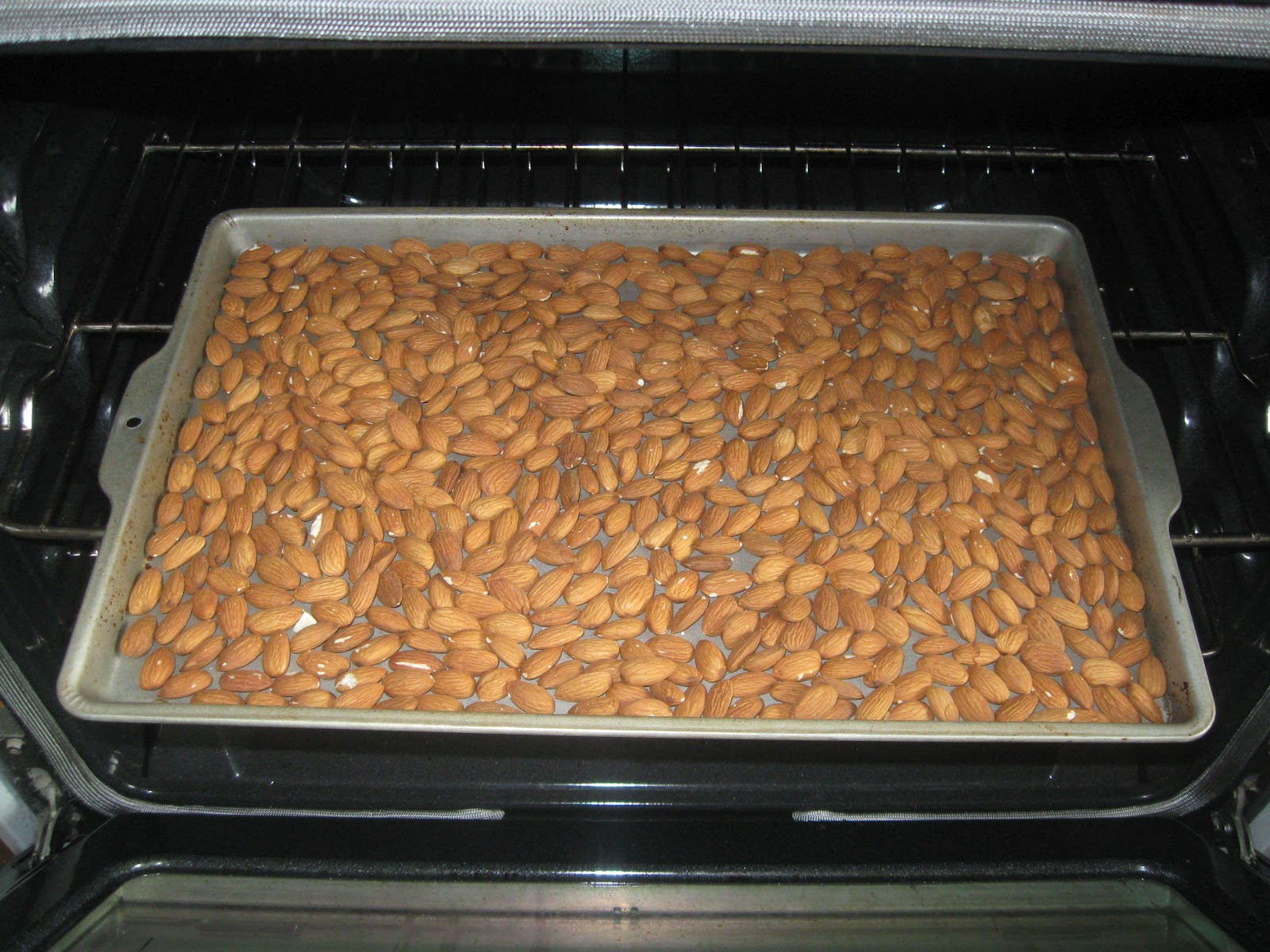 1. Preheat oven to 350. Spread the almonds on a cookie pan with four sides. (I think this is technically called a jelly roll pan.) Bake the almonds for about 10 minutes while you're getting the other ingredients together.