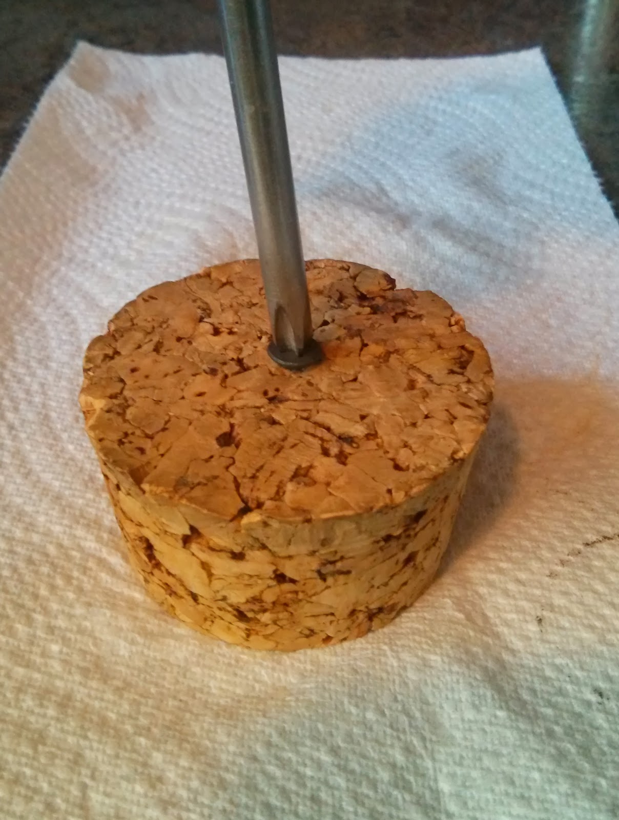 4. Find the center of the cork and use the wide-threaded screw to make a pilot hole by screwing it all the way into the cork. Remove screw.