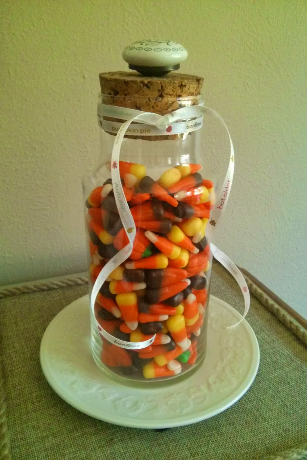 8. Tie a ribbon or twine around the neck of the jar. (Mine says things like "apple pie" and "pumpkins" on it.)