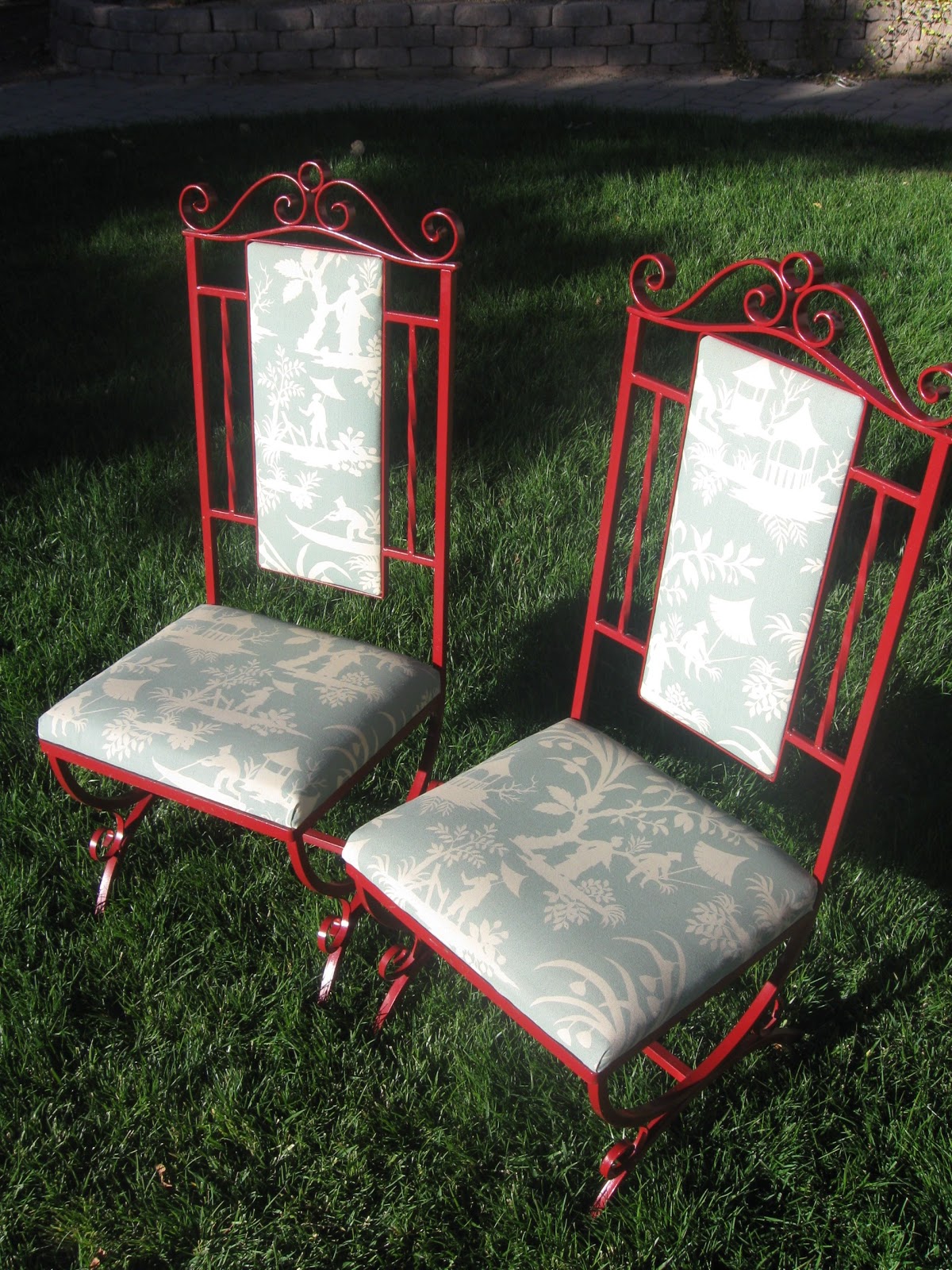 Then came the hunt for just the right fabric. It had to be something interesting, different, and most of all, cheap. I finally found a fun chinoiserie indoor/outdoor fabric in aqua and cream, which inspired the Chinese red for the frames.