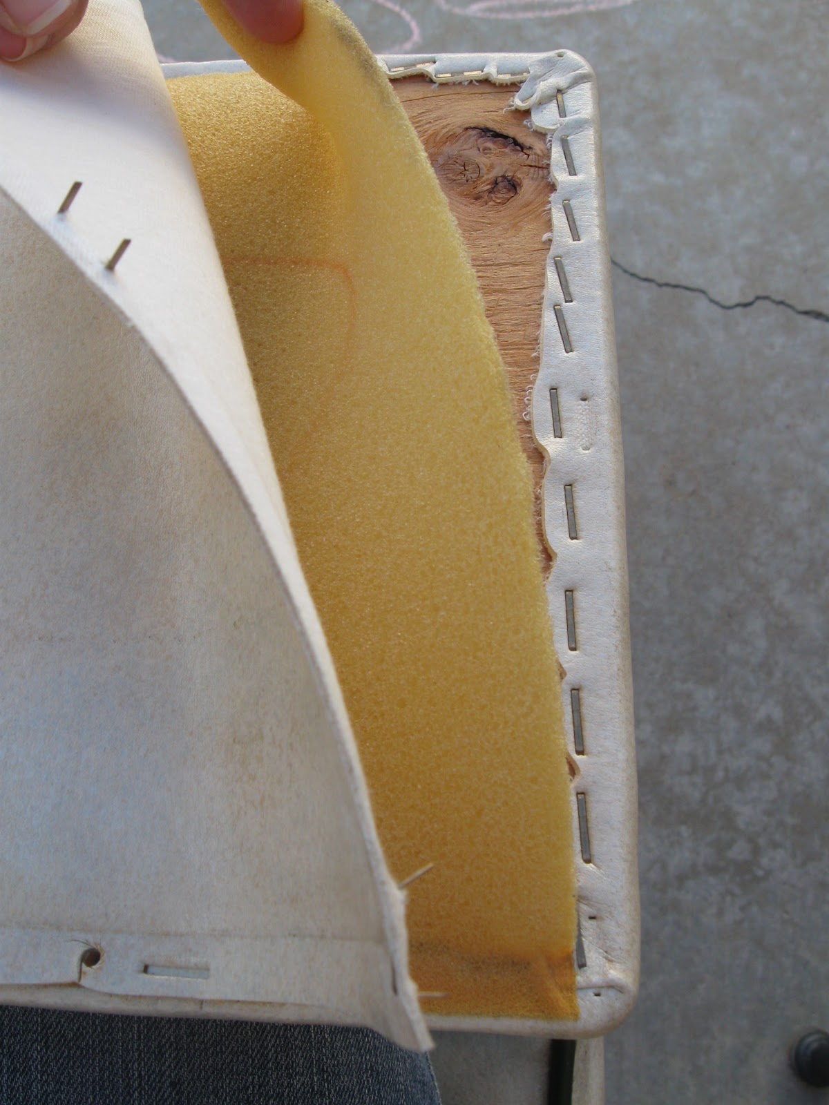 In enlisted my friend Jana to help me re-upholster the fabric parts, since that can sometimes be a two-person job, and everything is more fun with a friend anyway. We had a great time ripping everything apart and putting it back together again, and even had no leftover parts when we were done! We re-used the frames, the wood seat bases, and even the foam inside, which was in great shape, despite its probably 40 years of life. That ugly vinyl had some redeeming quality after all.