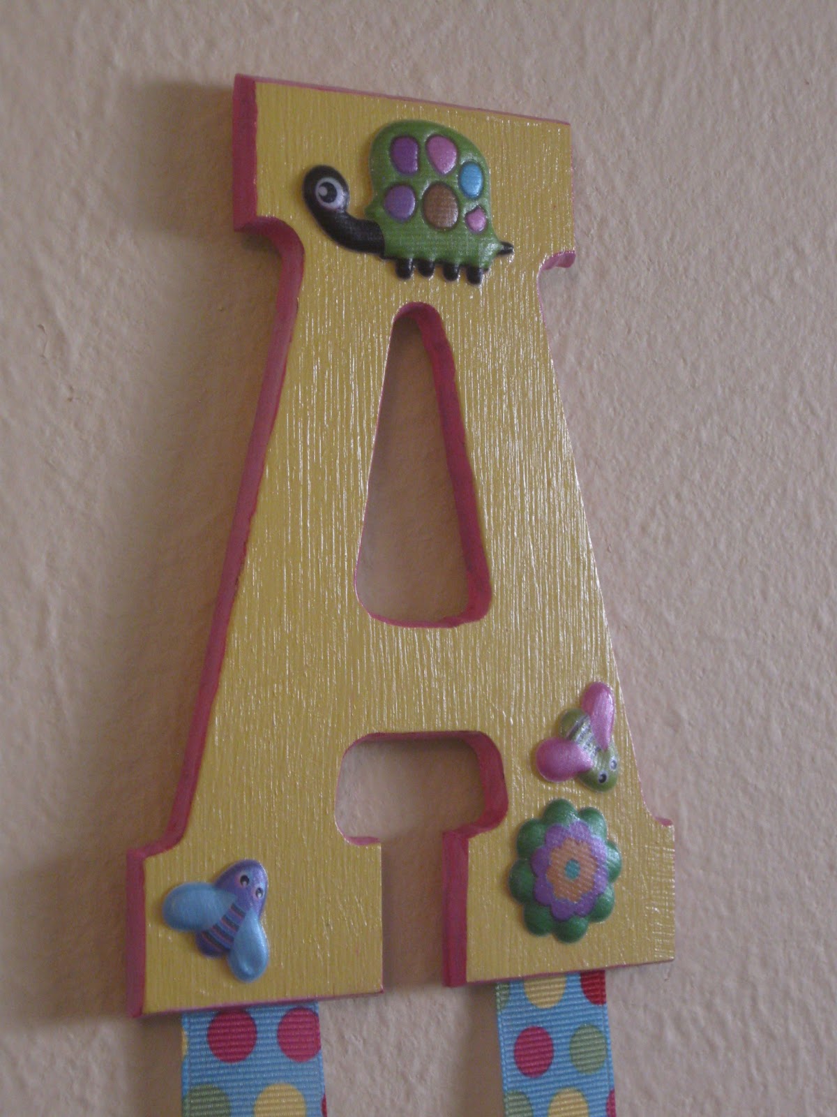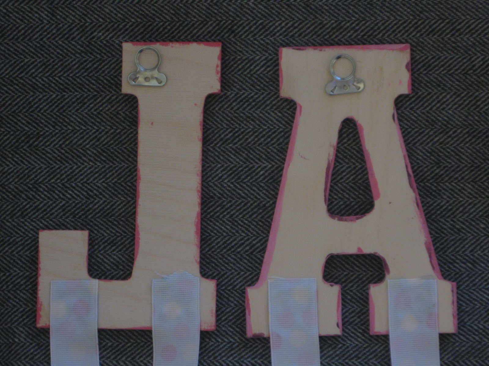8. Hot glue the ribbons to the back bottom edges of the letter, with at least an inch of ribbon glued on.